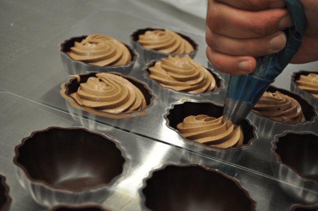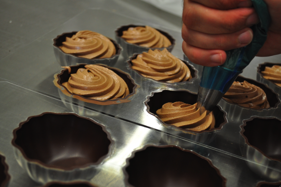 En sa compagnie, je me suis lancée dans la réalisation de macarons (oulala, que c’est compliqué!) et d’une savoureuse mousse au chocolat. J’ignorais à quel point le métier de pâtisser artisanal était un travail physique: pas si simple de mélanger des litres de crème, de maintenir incliné le bol d’un robot sur socle, … Pendant les fêtes, lorqu’il faut sortir 3.000 macarons par jour, des gâteaux, des chocolats, ça travaille ferme dans les ateliers liégeois!