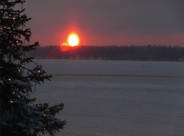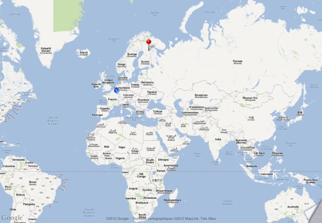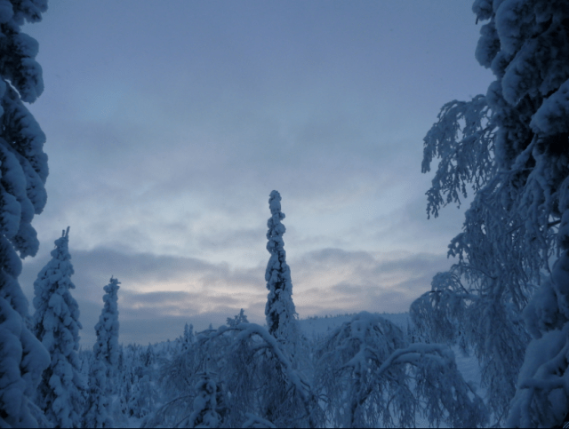 Avec moins de 4 habitants au km², Kuusamo (le petit point rouge sur la carte) est un désert blanc, sanctuaire naturel peuplé d’ours, d’élans, de rennes, de lynx et de loups. Oui, à Kuusamo, la moyenne des températures annuelles est de 0°C. Que ce soit en français « Laponie » ou en anglais « Lapland », cette région du monde m’a toujours fait rêver. Je n’ai jamais réellement aimé les vacances à la neige, pourtant j’ai adoré Kuusamo! Là-bas, au bout (du bout) du monde, la neige a des reflets pailletés. Tout est blanc immaculé. Calme. Silencieux. Propre. Reposant. Un havre de paix. Presque indescriptible tant l’agitation de nos villes (même du plus petit des villages) paraît si stressante à côté.
