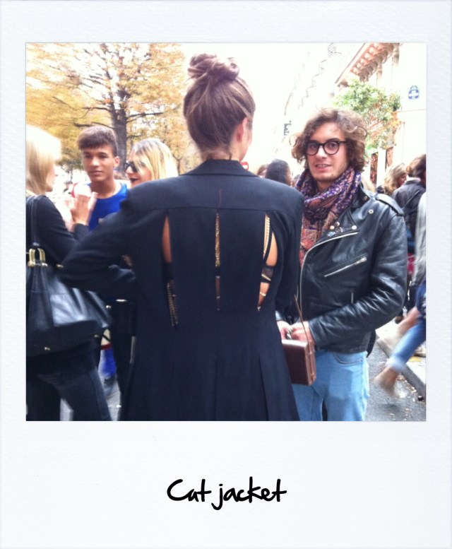Par leur beauté et leur style, certaines filles que je croise dans les rues parisiennes semblent tout droit sorties des pages de Vogue. Parfois, trop de pièces tape-à-l’oeil sur une même silhouette cassent l’harmonie de l’ensemble. Chez Carolina, pas du tout. Les chaussures couleurs pourpre et or à la découpe géométrique et la veste ajourée dans le dos, laissant apparaître chaînes et dorées soutien-gorge, électrisent le look. Quant aux cheveux négligemment attachés en boule, ils donnent un petit air non-apprêté… On tomberait presque dans le panneau.