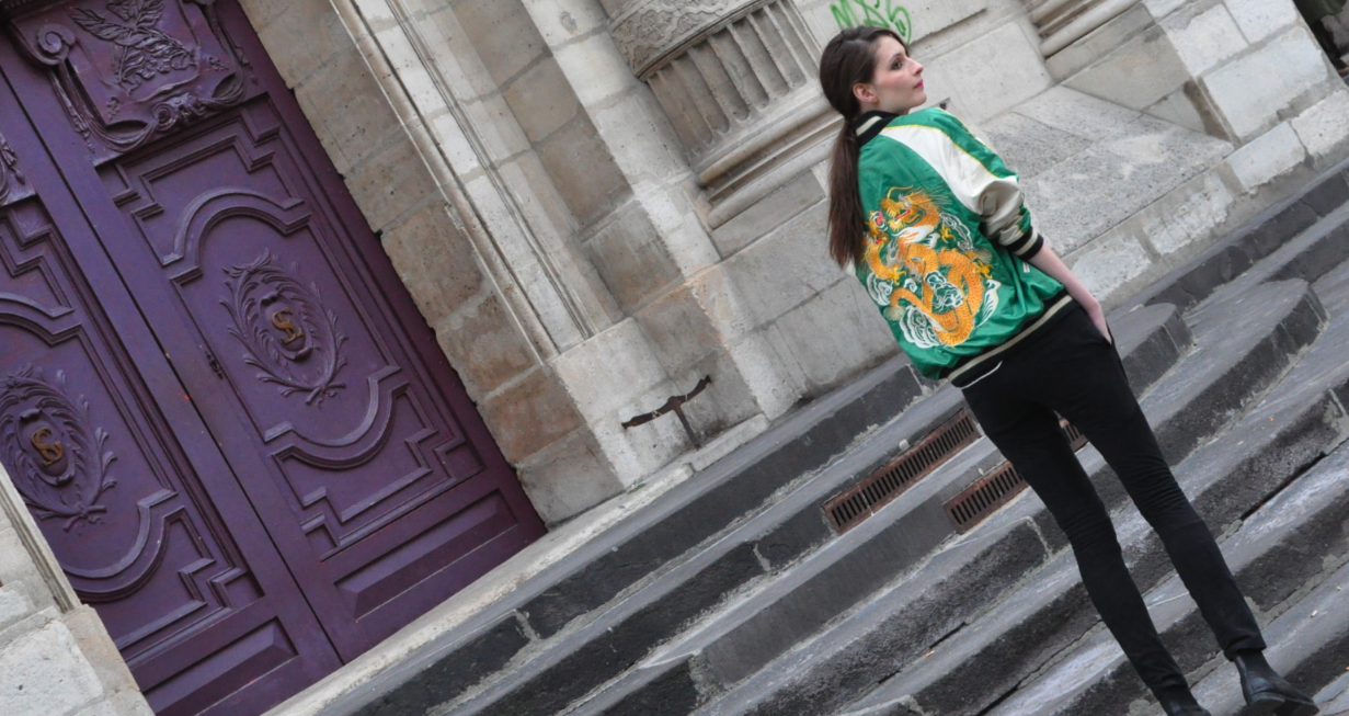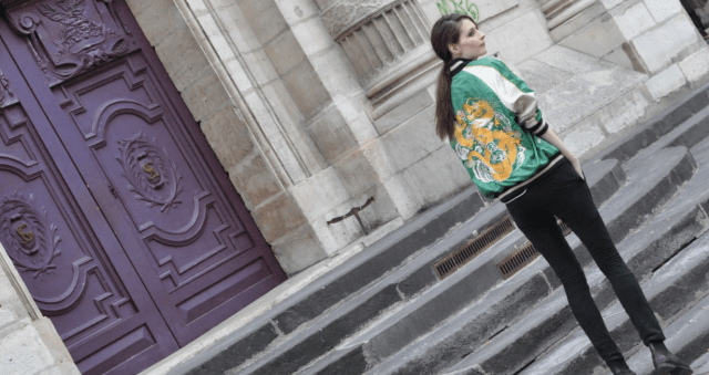 Coup de coeur pour veste façon « Teddy » au dos imprimé de motifs chinois. Ses petits plus? Le tomber parfait de la soie, sa brillance et son côté sporty-chic
