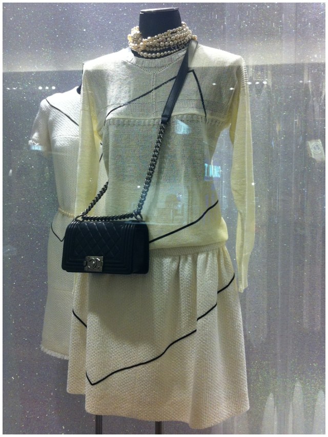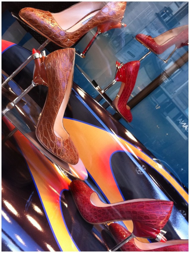 J’aime quand les « Visual Merchandisers » rivalisent d’idées pour nous scotcher à leur vitrine. C’est toute une technique de capter l’attention d’une shoppeuse pressée! Récemment, c’est Chanel et la fraîcheur de sa silhouette (photo 2) qui m’ont complètement conquise. A première vue, on dirait un look tout simple. Pourtant, lorsqu’on le regarde de près, on s’aperçoit de la richesse des tissus, du travail de la matière. Tout simplement superbe! Dans un tout autre style, j’ai adoré la scénographie choisie par Prada (photo 3 et 4) pour mettre en avant sa collection de chaussures printemps-été 2012 complètement dingue. Superhero, inspirée par les voitures américaines des fifties, a de quoi nous faire vrombir!