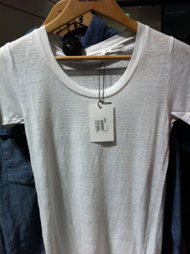 voilà, je suis passée chez Isabel Marant à Soho ce matin, pas de scandale, le T-Shirt est à 120 dollars, cela reste cohérent avec le prix européen, par contre, sans vouloir faire l’avocat du Diable, j’ai plutôt bien apprécie sa texture et son tombée, cela reste un basique mais ce n’est quand même pas un « bête » t-shirt blanc qu’on trouverait chez Uniqlo ou Gap. Je comprends donc que certaines clientes mettent le prix. Par contre, j’ai été horrifiée en voyant le prix d’un gros pull en laine : 2200 dollars, Argh, là, je suis sortie de la boutique scandalisée! 😉
