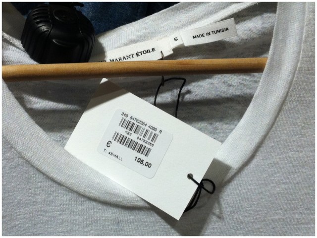tout à fait d’accord avec toi! 105 euros pour un t-shirt blanc juste parce qu’il y est apposée l’étiquette Isabel Marant, c’est se moquer des gens! (en plus, quand on lit Made in Tunisia juste à côté) j’accepterais de payer ce prix si le t-shirt était un poil plus créatif mais là, faut pas exagérer quand même!