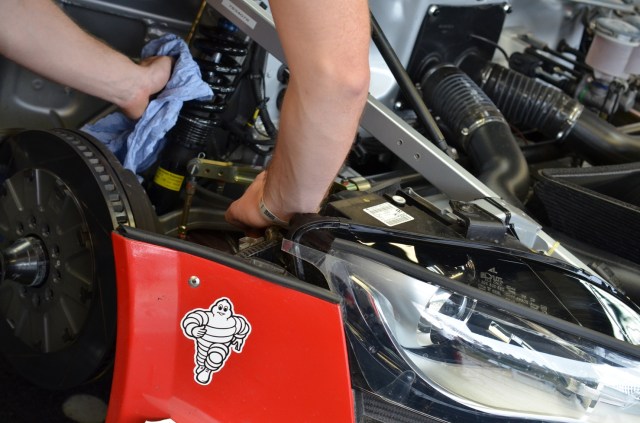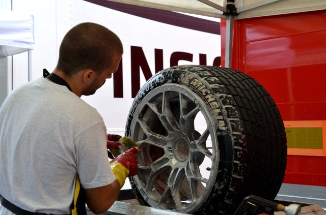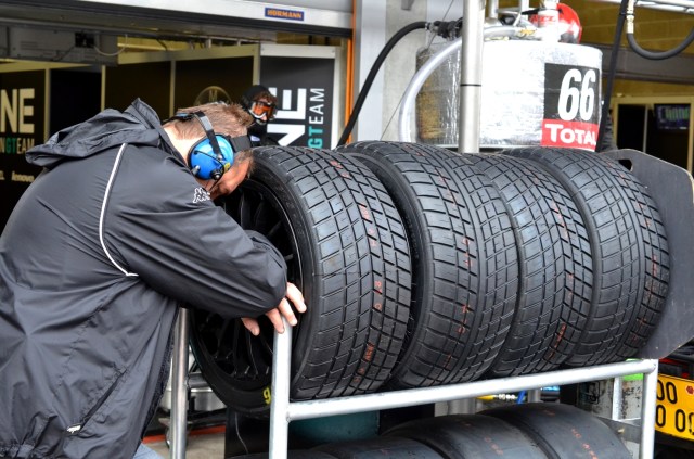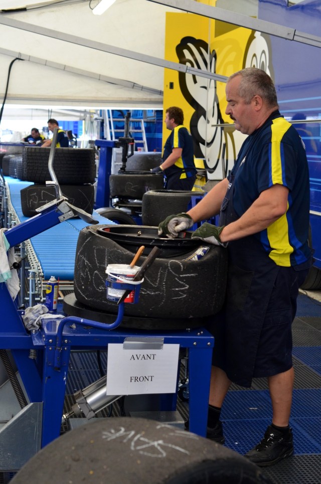 Après cette entrée en matière pleine de reconnaissance, plongeons dans le vif du sujet! Si Michelin a choisi de convier une poignée de blogueurs à cette course d’endurance mythique, c’est pour illustrer un des grands principes de la marque: le « From track to road« , une stratégie à laquelle j’avais été initiée à Estoril et à Riga. Concrètement, en s’investissant massivement dans la compétition automobile (pour cette course, Michelin était le fournisseur officiel des pneus des 66 GT3 en lisse, soit environ 10.000 pneus -6.500 slicks et 3.500 pneus pluies-), la firme française se dote d’un laboratoire inégalable pour développer les technologies qu’on retrouvera peut-être demain sur les pneus des véhicules destinés au grand public. Imaginez, les contraintes techniques et les besoins spécifiques sont tels qu’ils offrent, en effet, une source impressionnante de réflexions pour le département R&D.