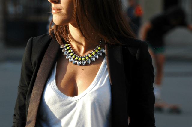 Il y a quelque temps, toute la blogosphère s’enflammait pour ce coller néon, agrémenté de strass, de chez H&M. Rapidement sold out, il s’arrachait parfois pour 4 fois son prix sur eBay (et oui, « traders » en colliers H&M, c’est ça la loi du marché!). Tout ça ne me faisait ni chaud, ni froid. Je le trouvais joli, sans forcément m’imaginer le porter. Préférant le modèle plastron (H&M également), un peu dans le même esprit, que j’avais déjà. Fort de son succès, l’enseigne suédoise a décidé de le ré-éditer (dommage pour celles qui l’ont payé plein pot!). C’est là que je suis tombée dessus. Moi qui le trouvais fort « fantaisie » en photo, j’ai finalement craqué pour son côté fun, estival. Un accessoire zéro prise de tête pour l’été. Nickel pour les vacances, sur une peau légèrement hâlée…