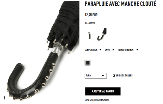 En septembre, je vous parlais de mon coup de coeur pour le parapluie Burberry au manche clouté. Graou graou! Evidemment, à 750€, il y avait bien plus utile comme achat impulsif. Affaire classée donc. Mais dans son commentaire, ma charmante lectrice marie_vdk avait bien senti l’habituel ersatz espagnol arriver tel un traître par le sud: «Avec un peu de chance, dans quelques jours, on trouvera des parapluies cloutés chez Zara». Bingo: il est arrivé! En version courte, moins smart, mais avec le manche en cuir clouté. Un bon compromis pour celles qui estiment que 12,95€ est le juste prix pour un parapluie…