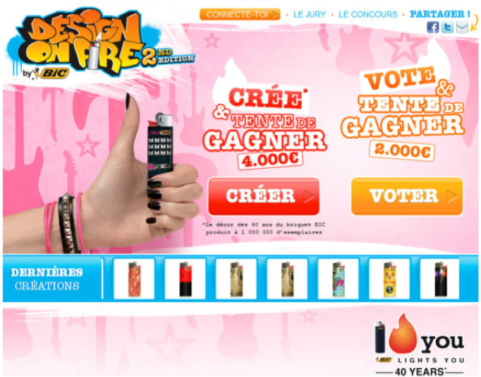 Pour participer, tout se passe en ligne avec les outils indispensables pour concevoir le look du briquet star de la rentrée. Sur la page Facebook Design on Fire, on admire la créations, on like son désign préféré, on commente, … Tout ça, jusqu’au 1er Mars 2013. Bonne chance à ceux qui se lanceront dans l’aventure!