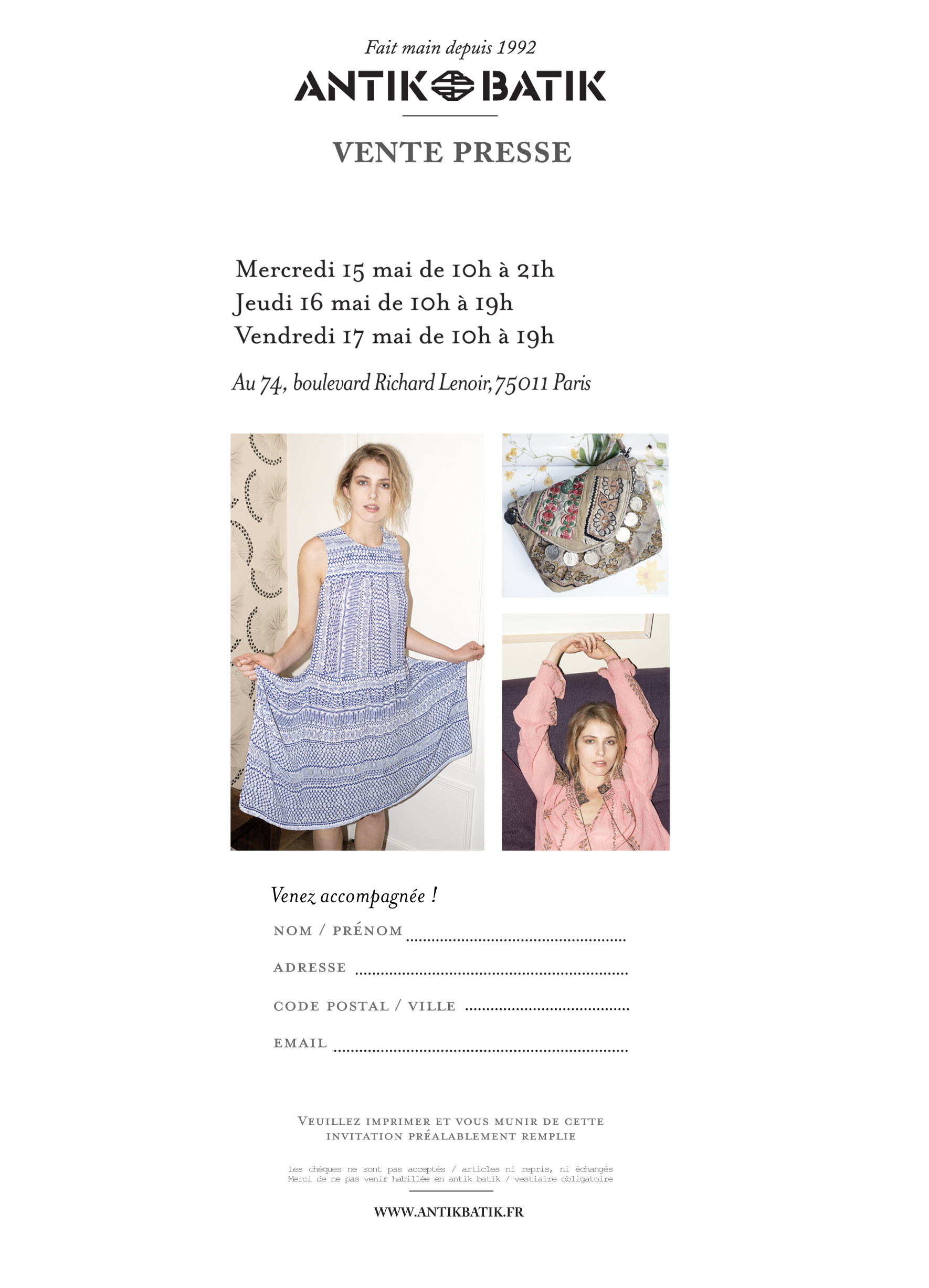 Alerte au bon plan: de demain à vendredi, c’est la vente presse ANTIK BATIK! Ce style gipsy chic coloré et les broderies si caractéristiques de la marque créée en 1992 par Gabriella Cortese me rendent complètement dingues! J’avoue, les prix (même si amplement justifiés par la qualité) aussi! Du coup, pour craquer sans (trop) se ruiner, on imprime l’invitation ci-dessous et on file avant le week-end au 74 boulevard Richard Lenoir dans le 11ème. Bon shopping!