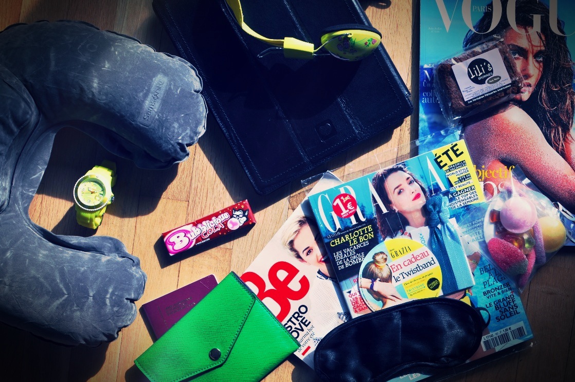 Photos: Alerte à Liège // Etui pour passeport: Michael KorsEtui pour iPad (chargé de films et de magazines): DelseyMontre Ice-Sunshine: Ice WatchCoussin de voyage: Samsonite – Bonbons et Bubblicious goût Cola.