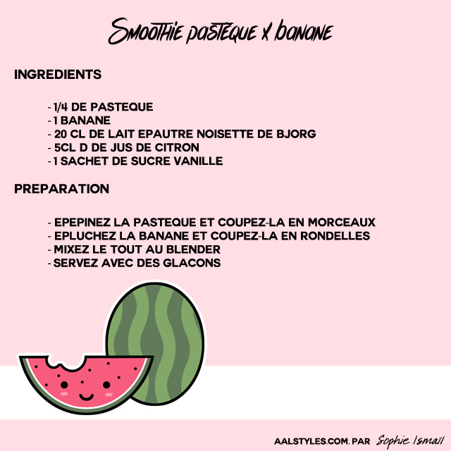 Hello les cats! La forme? Depuis que j’ai acheté un blender pour faire des smoothies, je n’arrête pas. Personnellement, j’ajoute toujours aux fruits du lait végétal. Mon préféré reste le lait épeautre noisette bio de Bjorg. Récemment, j’ai voulu testé la boisson à l’avoine bio de Carrefour car c’était un peu moins cher mais je n’ai pas vraiment aimé. Beaucoup moins gourmand. Du coup, ce week-end, j’ai voulu tester une nouvelle recette de smoothie: pastèque x banane. J’ai adoré! Du coup, voici ma recette. Bonne dégustation!
