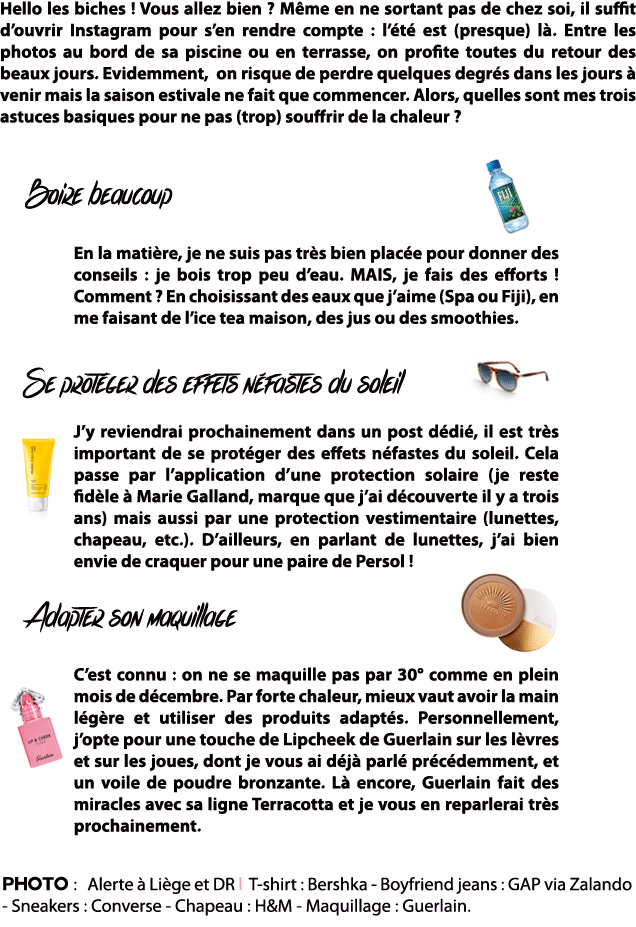 Classé sous Belle, belle, belle!, La Minute Mode!, Lifestyle · Tagged with #bershkastyle, Bershka, Canicule et chaleurs extrêmes, Comment se maquiller quand il fait chaud, Conseils pour se maquiller quand il fait chaud, Converse, Eau Fiji, Fiji, Gap, Goossens, Goossens Paris, Guerlain, Guerlain Terracotta Sun Trio, Guerlain Terracotta Sunless, Guerlain Terracotta Ultra Shine, H&M, La Petite Robe Noire Lipcheek, La Petite Robe Noire Lipcheek de Guerlain, Maquillage et chaleur, Maria Galland, Persol, Zalando