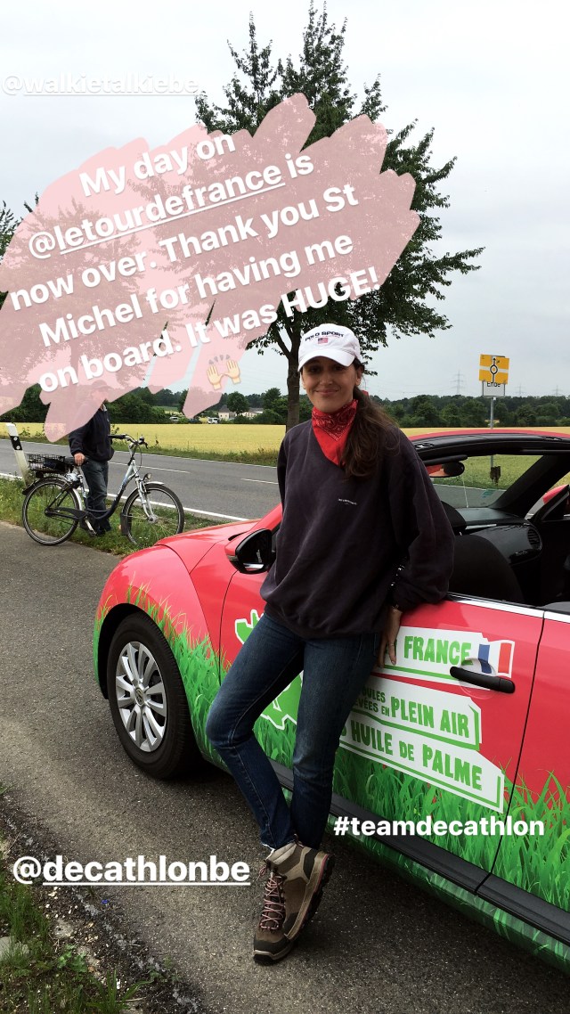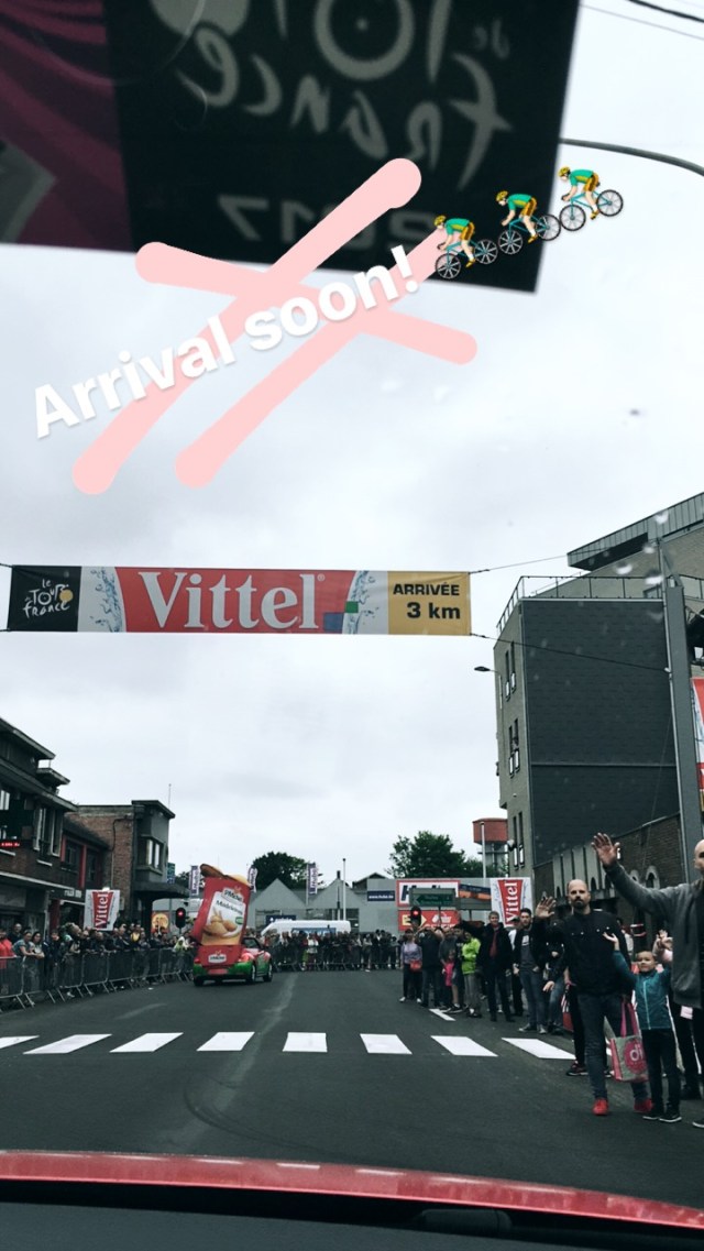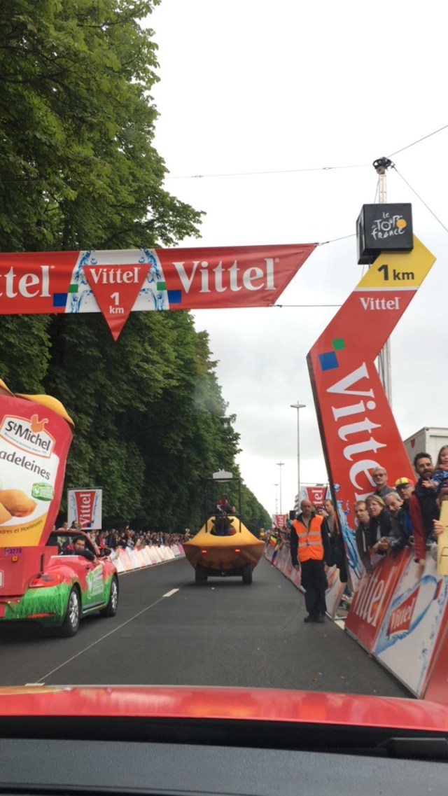 C’était assez incroyable de me retrouver embarquée à l’avant de l’une des trois voitures cabriolet aux couleurs de St Michel (devancée par le véhicule en forme de madeleine XXL et suivie par un char équipé de catapultes à madeleines!), à faire signe à une foule en délire sur 203.5km. Car oui, ce qui m’a le plus marquée, ce sont ces DIZAINES DE MILLIERS de personnes de tous les âges sur le trajet (des petits bouts, des femmes enceintes, des personnes âgées,…) avec une énergie à revendre, heureuses d’être là, souriantes, faisant signe ou encore se réjouissant d’attraper l’une des 100 000 madeleines distribuées chaque jour sur le Tour (soit 2 millions jusqu’à la fin du jour, le 23 juillet). L’espace d’une journée, on oublie l’actualité morose des derniers mois et, GOD, ça fait du bien!