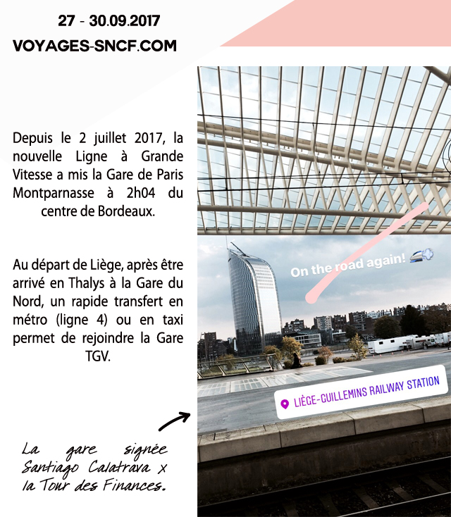 Le 2 juillet 2017, la nouvelle LGV reliant Bordeaux à Paris a pris de la vitesse : Paris-Bordeaux en 2h04, soit un gain de temps de 1h07. Énorme! Bordeaux plus rapidement accessible que jamais depuis Paris, c’est aussi pour nous, Belges, une destination de citytrip qui s’offre plus facilement à nous. Et quand on sait que la capitale du vin a été élue 1ère au classement mondial des villes à visiter en 2017 selon Lonely Planet, ça donne forcément envie! D’ailleurs, saviez-vous que Bordeaux est inscrite depuis 2007 sur la liste du patrimoine mondial de l’UNESCO? Quant à l’itinéraire de voyage? Thalys jusqu’à la Gare du Nord, transfert vers la Gare Montparnasse pour prendre le TGV et c’est parti! Si vous êtes un passionné de gastronomie, prévoyez un peu de temps à la Gare du Nord pour manger à L’Etoile du Nord, la table du célèbre chef Thierry Marx. Une adresse inaugurée en novembre 2016, dans un écrin conçu par l’architecte Patrick Bouchain, comme un hommage aux buffets de gare. Un sans-faute!