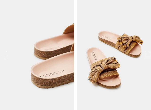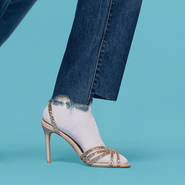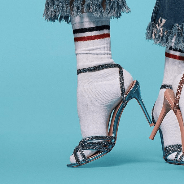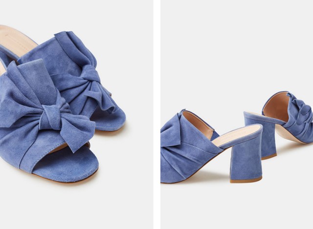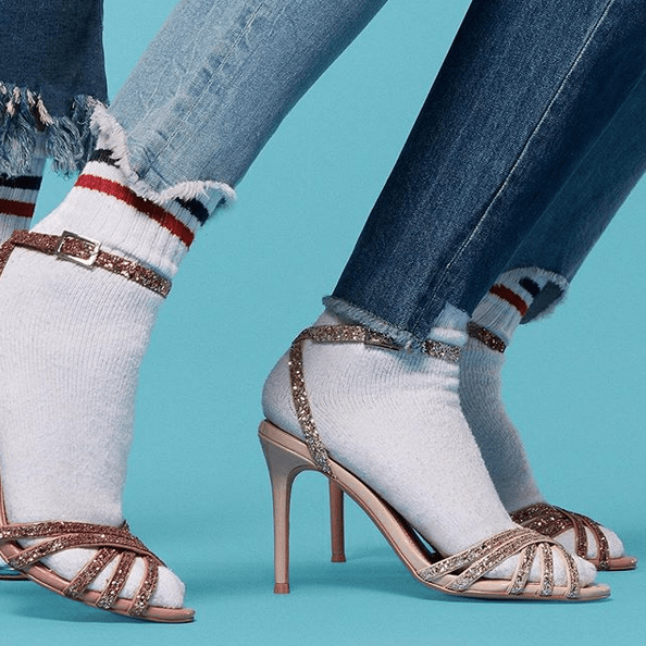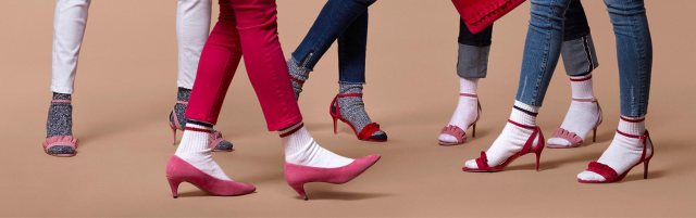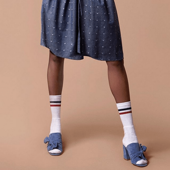 Du coup, avec quelles sandales les porter ? Au final, aucune limite à la créativité ! Chez Esprit, j’aime beaucoup le mariage des chaussures hyper féminines, raffinées, aux talons modérés avec l’inattendu de la chaussette de sport. Mon coup de cœur ? Le combo réussi du denim x sandales à effet pailleté scintillant et fines brides x white socks. Parfait pour chausser son modèle préféré sans que les températures affolent déjà le thermomètre, comme c’est le cas en ce milieu de printemps. Une paire de mules en daim ornées d’un nœud et leur imposant talon bottier, comme ci-dessous, peut également être une excellente option stylistique pour oser afficher une personnalité bien trempée jusqu’à la pointe des pieds. Alors, dites-moi tout : ça vous donne envie de craquer ?