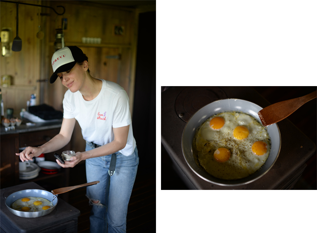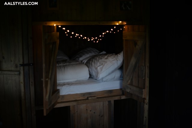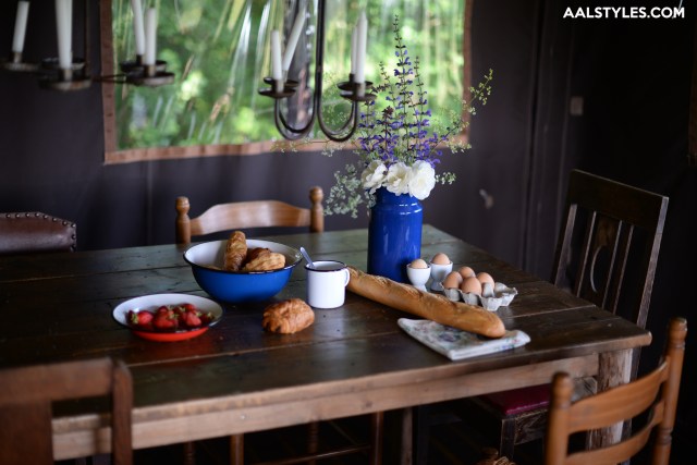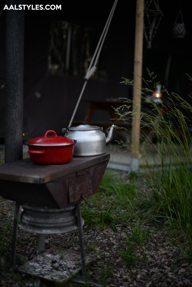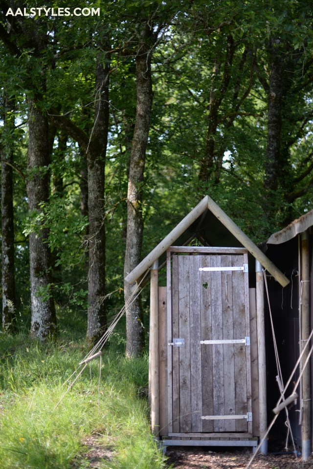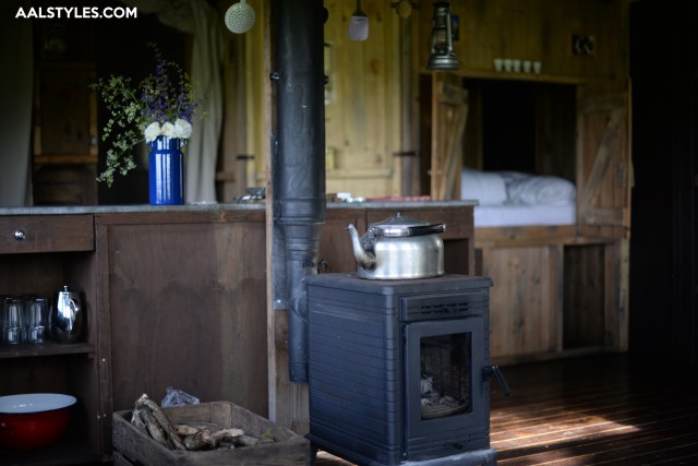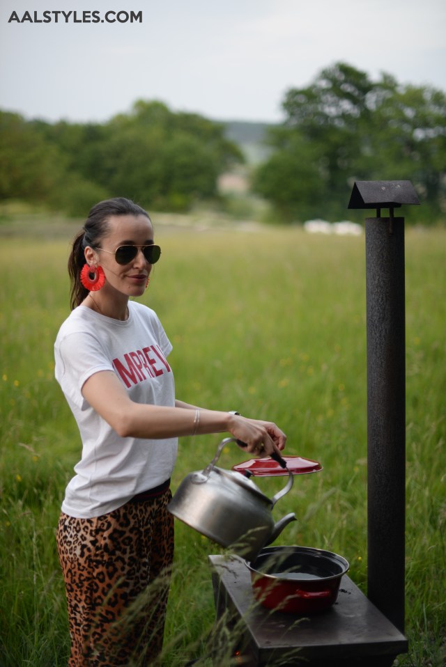 Concrètement, ça se passe comment? A peine arrivée à La Grange du Bost, accueil prévenant des maîtres des lieux. Les valises sont à emporter dans la « Noble Tente » en brouette, chemin interdit à la voiture oblige. A peine arrivée dans la tente, les yeux s’écarquillent : tellement bohème-chic! Vos nombreuses réactions enthousiastes à ma Story Instagram prouvent que j’étais loin d’être la seule complètement fan de l’esprit des lieux. Ici, pas d’électricité, ni de wifi. L’éclairage se fait à la bougie ou avec des lampes à pétrole. Oubliez donc l’idée de recharger votre ordinateur ou votre smartphone dans la tente, de vous y sécher les cheveux, etc. Par contre, une literie hyper confortable (dont, mon rêve : un lit cabane en bois super-cosy), du parquet au sol, un canapé, des toilettes, une douche extérieure privative et tout le confort pour passer des vacances zen au vert, entourés de bois et de collines. Chaque ferme possède un cellier, une épicerie fine pour acheter des produits locaux et régionaux. Idéal pour ceux qui, comme moi, raffolent de faire leurs courses en circuit court. Parfait pour se mijoter de bons petits plats dans sa tente! En effet, dans le superbe coin cuisine de la tente, il y a l’accès à l’eau courante, un poêle à bois avec trois plaques (qui permet aussi de chauffer la tente), des ustensiles de cuisine (casseroles, poêles, etc), la vaisselle nécessaire tandis qu’un barbecue Weber complète le tout sur la terrasse extérieure. Le kiff de cuisiner de bons produits dans ce contexte magique!