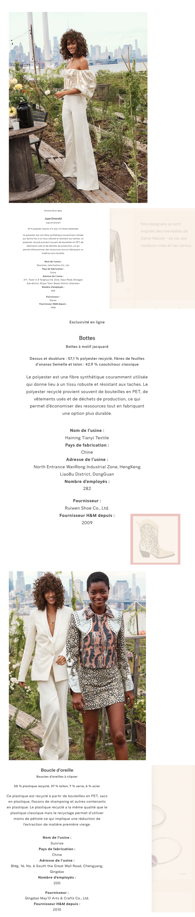 En surfant sur le site de H&M à l’occasion du lancement de la collection Conscious Exclusive, j’ai pu m’apercevoir que la fiche-produit mentionnait, notamment, le nom de l’usine et son adresse exacte, l’identité du fournisseur et la date depuis laquelle H&M collaborait avec lui. Une façon de répondre aux inquiétudes des consommateurs sur les méthodes de fabrication des grandes enseignes. Au client d’acheter en tout état de cause, certains préférant un engagement encore plus fort comme le Made in France (ou in Europe) et la main-d’œuvre locale. À vous de voir…