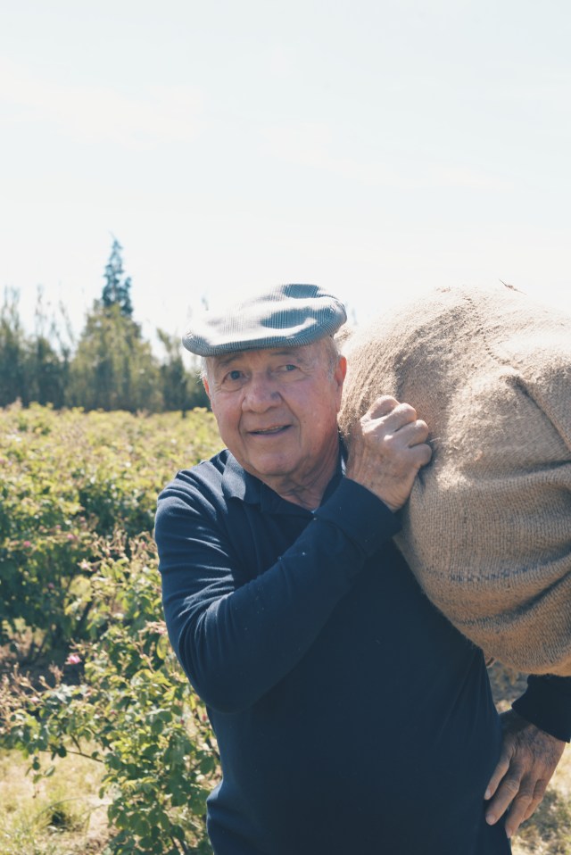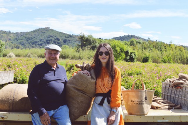 Aujourd’hui âgé de 80 ans, Joseph Mul n’a absolument rien perdu de son énergie et de son beau sourire. Après avoir entendu parler de lui et lu son nom dans de nombreux articles de presse, j’étais aux anges de pouvoir passer un moment avec lui. Après avoir choisi entre la bicyclette ou la golf car (j’avoue : j’ai opté pour la voiturette !) pour rejoindre La Bastide et enfilé nos bottes en caoutchouc Chanel, c’est à ses côtés que nous avons eu le plaisir de partir à travers champs et de découvrir comment sont cueillies les roses Centifolia ou roses de mai, qui doivent leur deuxième nom au mois où elles sont récoltées. Car, comme aime le dire Joseph Mul : « Chaque fleur est une saison ». 50 000 plants de rose sont cultivés. Ici, la cueillette se fait à la main. Devant nos yeux, les cueilleuses aux gestes précis remplissent leur tablier de fleurs tout juste épanouies, au parfum délicieux. Je m’essaie également à l’exercice. 1 kg de roses représente 350 fleurs. Chaque cueilleuse récolte 5 kg de fleurs par heure.