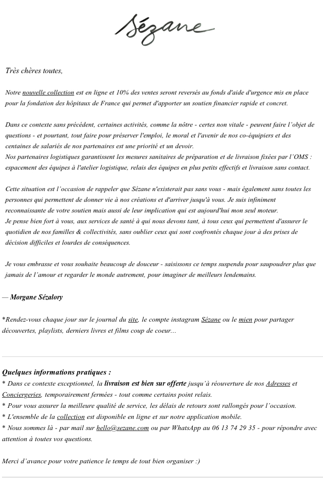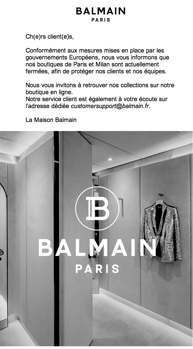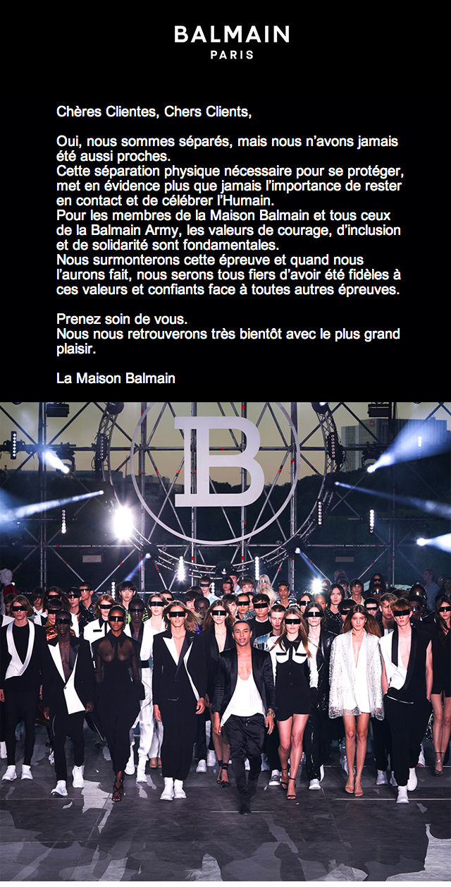 - même, si évidemment, nous vivons une situation hyper anxiogène pour toute marque qui s’interroge sur sa pérennité, voyez plus large que votre produit et l’aspect logistique. Balmain est, à mes yeux, un exemple de contenu hyper froid à ne surtout pas dupliquer : où est l’humain dans tout ça ? (cf. EDIT du 19.03 : ce midi, Balmain a rectifié le tir en envoyant une newsletter remplie d’énergie, d’humanité et d’espoir) ;