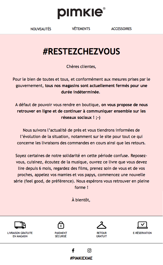 Classé sous Cabinet de conseil, La Minute Mode! · Tagged with #PIMKIEXME, 6 conseils pour des newsletters réussies, Agence de conseil en communication digitale, And Other Stories, Antik Batik, Balmain, Barbara Boccara & Sharon Krief, Bash, Cartier, Coaching en communication digitale, Communication de crise réussie, Communication digitale, Conseil en communication digitale, Corinne Le Foll, Coronavirus, Covid-19, Evelyne Chétrite, Newsletters réussies, Pimkie, Roseanna, Sandro, The Kooples, Yves Rocher, Zadig&Voltaire