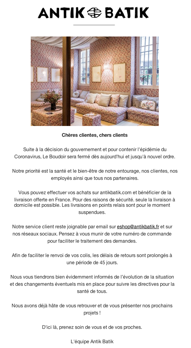 - plus que jamais, renforcez le lien avec votre communauté. Une marque, c’est un esprit d’équipe, ce sont des hommes et des femmes. Faites résonner vos valeurs, apportez votre soutien, revenez-en à l’essentiel ;