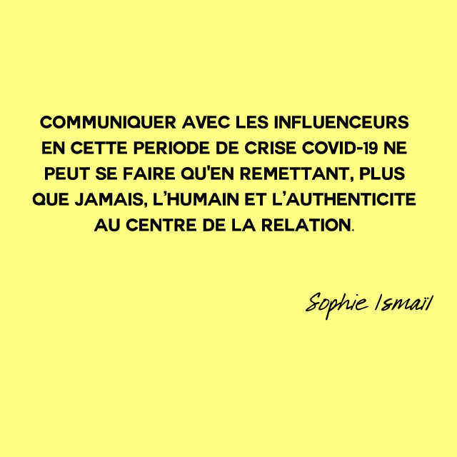 Aujourd’hui, en pleine crise Covid-19, alors que plus de 4 milliards de personnes, soit plus de la moitié de la population mondiale, sont appelées – ou obligées – à rester confinées (chiffres : Le Monde du 07/04/2020), une question que me posent fréquemment mes clients est : « Faut-il continuer à collaborer avec les influenceurs en cette période ? ». Si ma réponse est un grand OUI, cela ne peut se faire qu’en intégrant parfaitement le contexte dans lequel on évolue et, en anticipant, les probables bouleversements que cette crise va apporter, en termes de décroissance, de relocalisation, de sustainability, de transparence et de reconstruction ou réinvention du système économique existant. Concrètement, communiquer avec les influenceurs en cette période ne peut se faire qu’en remettant, plus que jamais, l’humain et l’authenticité au centre de la relation.