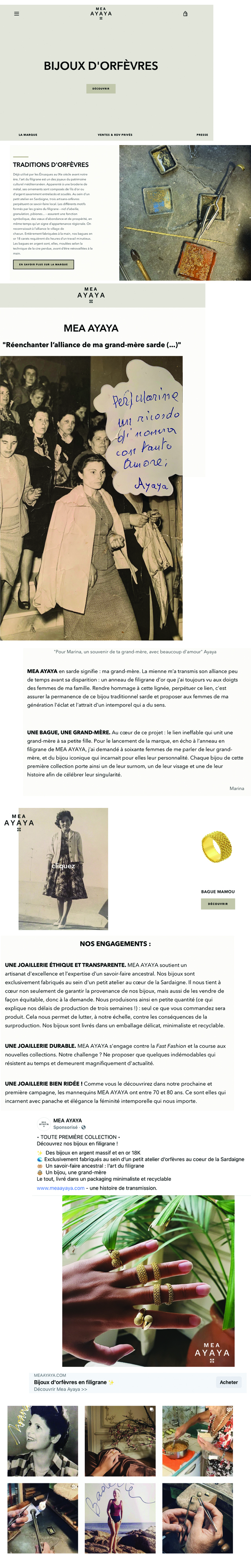 Toujours Ă l’affut d’exemples Ă montrer durant mes cours, je suis tombĂ©e sur une social ads Facebook de la marque de joaillerie Ă©thique MEA AYAYA qui a attirĂ© mon attention. Au coeur du rĂ©cit, une grand-mĂšre. Celle de Marina Dessi, la fondatrice de la marque, qui fait revivre, au travers de sa Maison, l’alliance de sa grand-mĂšre sarde. C’est diablement beau.