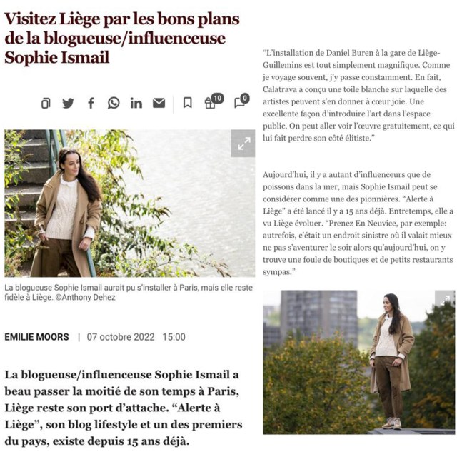« Y a-t-il plus à découvrir à Liège que les gaufres, les boulets et le café ? », telle est la question que la journaliste Emilie Moors m’a posée pour Sabato, le supplément lifestyle du quotidien économique belge L’Echo sorti ce jour, 15 octobre 2022. Aux côtés de cinq autres personnalités liégeoises, avec en toile de fond la découverte de la nouvelle installation artistique de Daniel Buren à la gare de Liège-Guillemins, je livre ma vision de Liège ainsi que mes adresses coups de coeur. Bonne lecture et bienvenue à tous les lecteurs arrivés ici via cette belle interview !